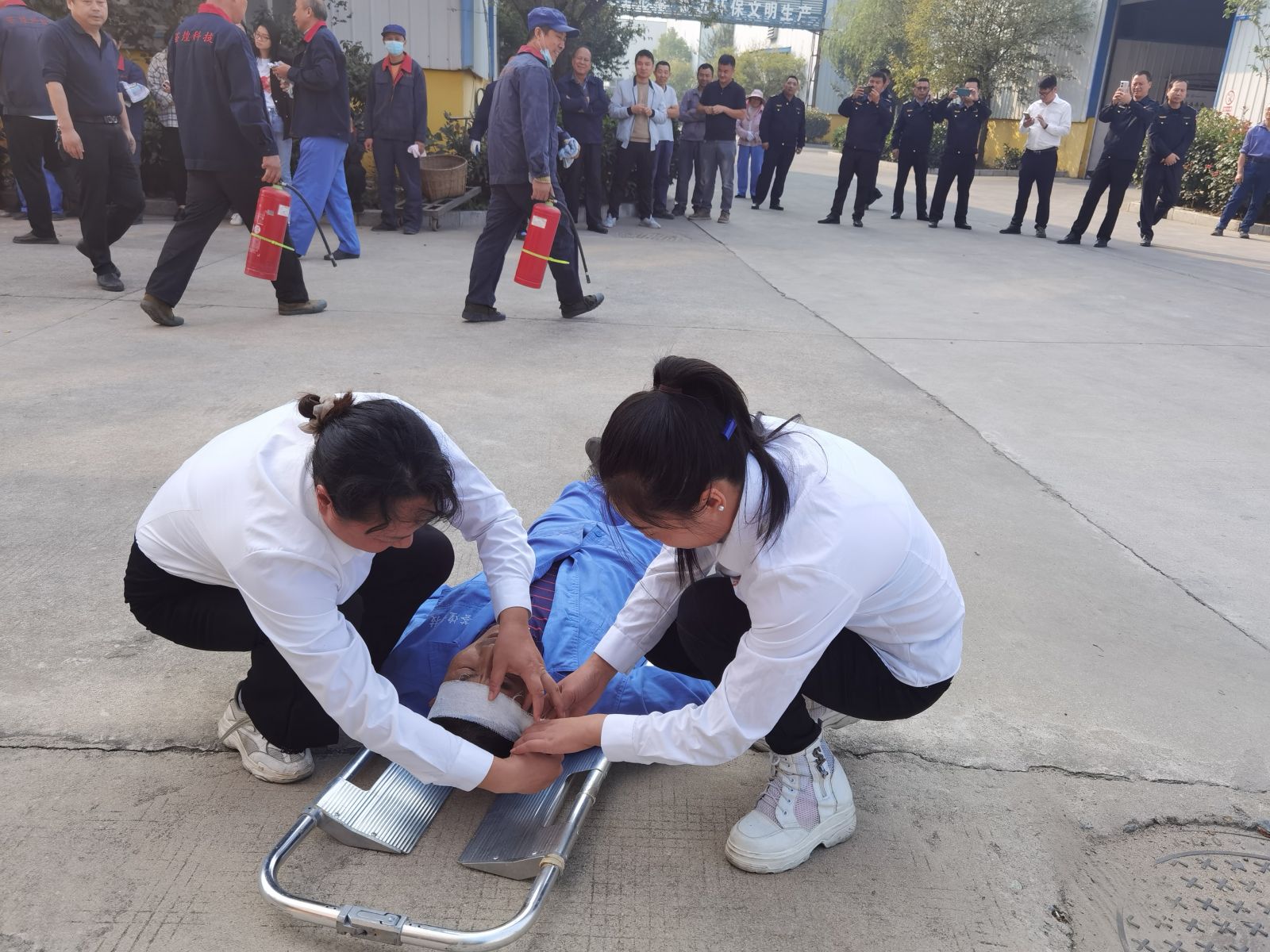 通過前期準(zhǔn)備與溝通,整個(gè)演練過程共分成八個(gè)場(chǎng)景:火災(zāi)發(fā)生----撥打119----啟動(dòng)應(yīng)急預(yù)案----控制火情----組織人員疏散-----轉(zhuǎn)移負(fù)傷人員----醫(yī)療救護(hù)-----總結(jié)。
